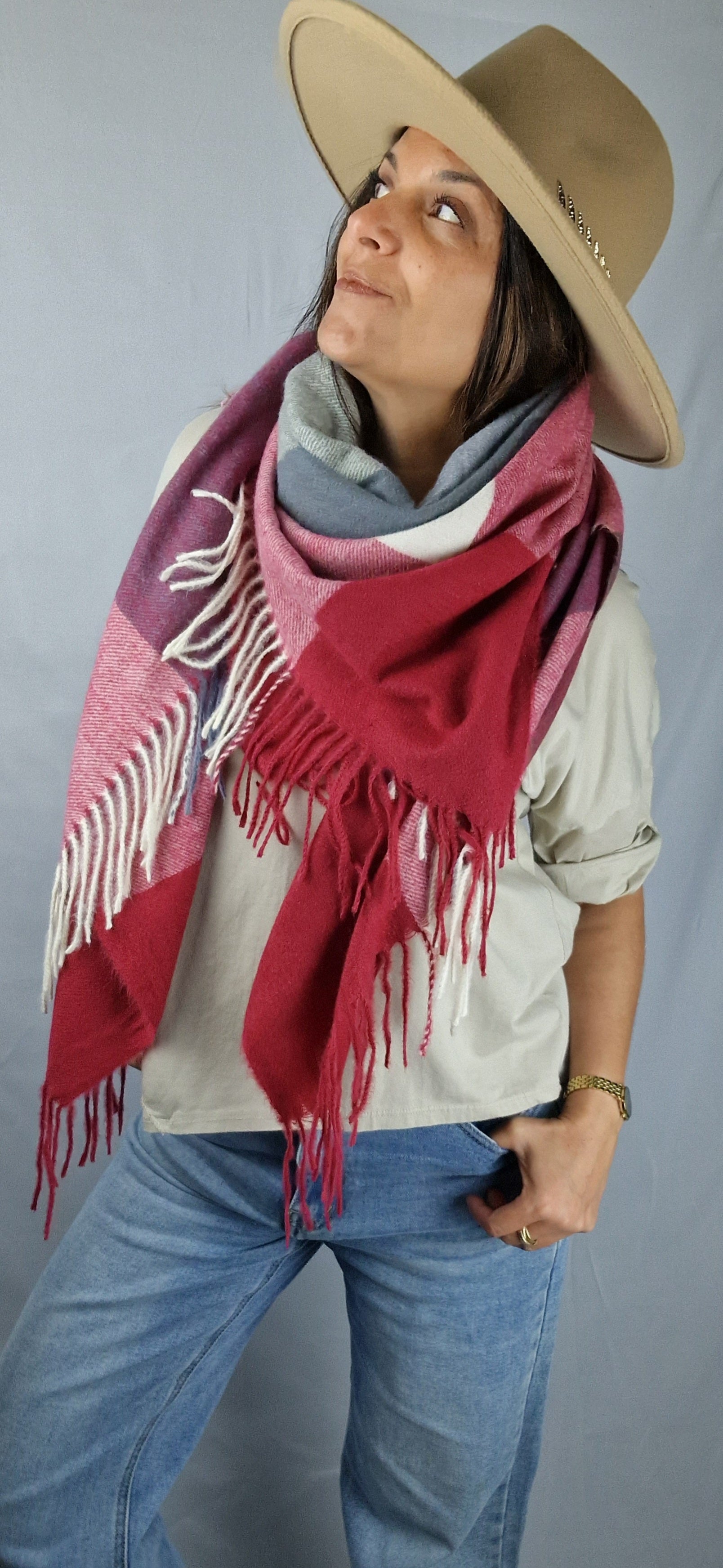 BLACK, l'étole élégante est un incontournable pour ajouter une touche de couleur et de chaleur à vos tenues d'hiver. Avec son motif à carreaux composé de rouge profond, de beige crème et de gris doux, elle sublime chaque look avec raffinement.