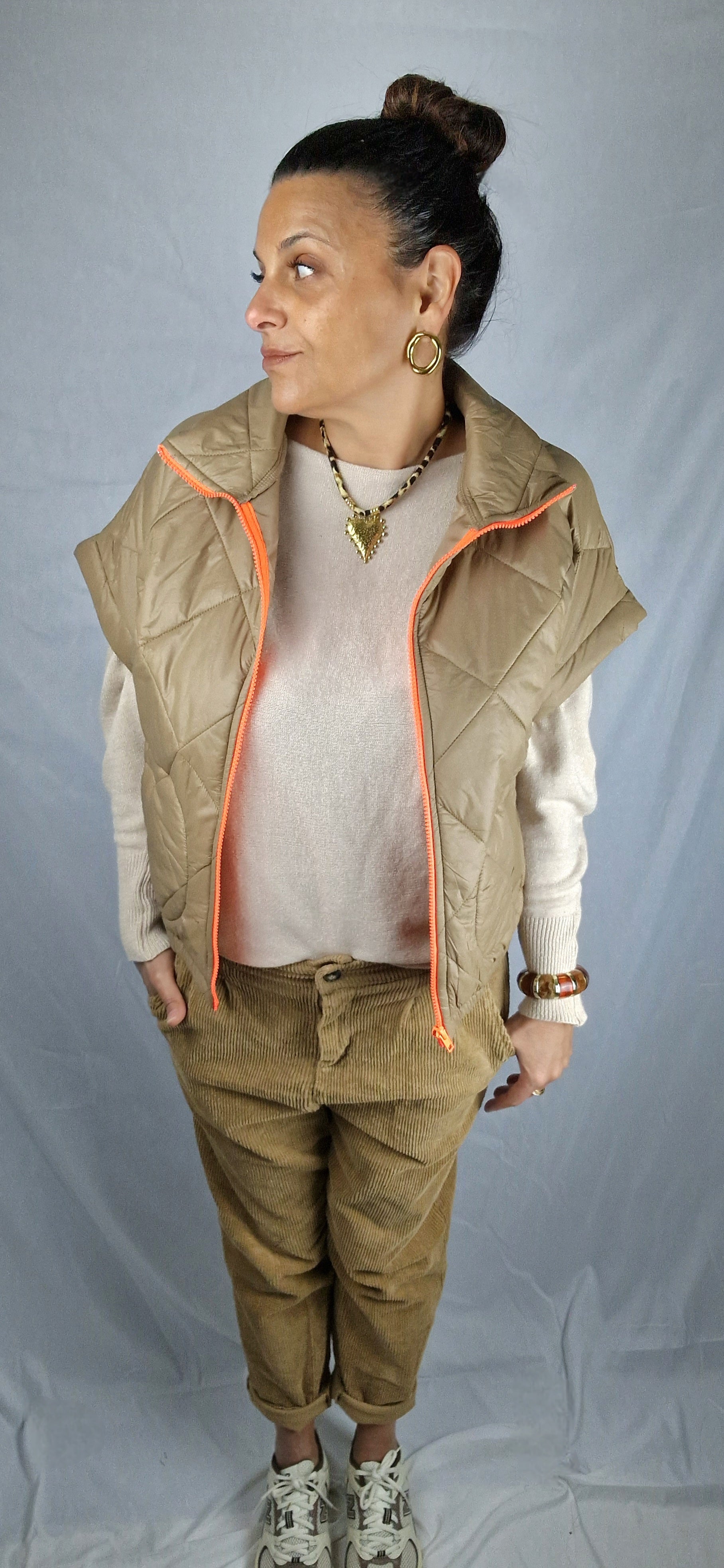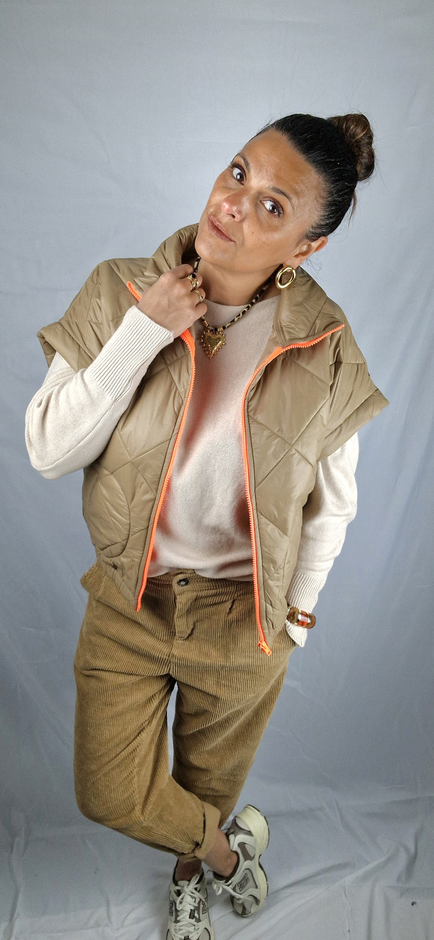 Chaleur et style se rencontrent avec Axelle, cette cape matelassée courte et sans manches. Facile à porter sur une chemise ou un pull, elle apporte confort, modernité et allure branchée à vos tenues. Les coutures en relief, le col montant et la fermeture zippée orange fluo ajoutent une touche urbaine et contemporaine, tandis que ses deux poches avant la rendent pratique au quotidien.