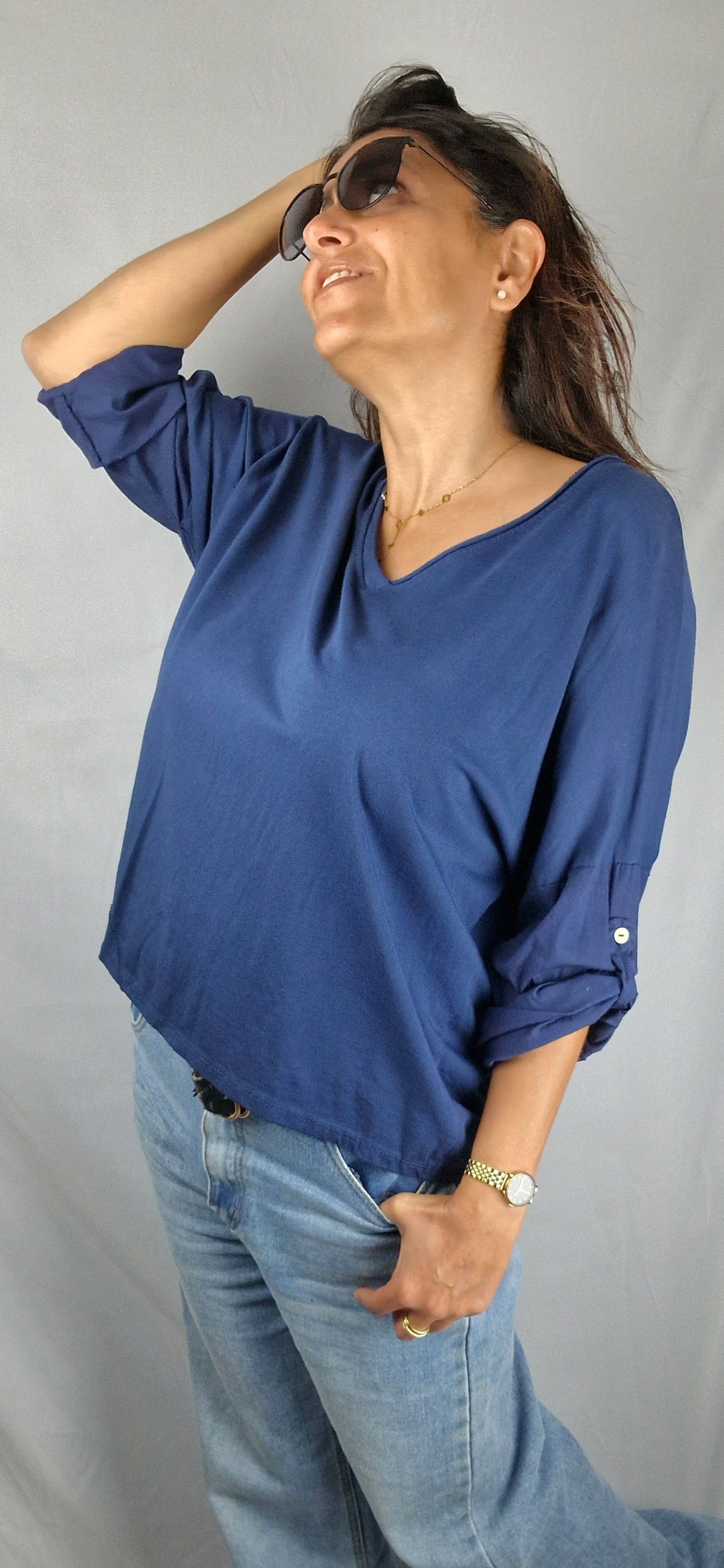 Un style à la fois décontracté et lumineux. Le top col V bleu se porte seul ou sous une veste légère pour un look plus structuré. Sa matière douce et légèrement extensible offre confort et liberté de mouvement, idéale pour la journée comme pour les moments plus habillés. Ses manches retroussables ajoutent une touche pratique et élégante à vos tenues.