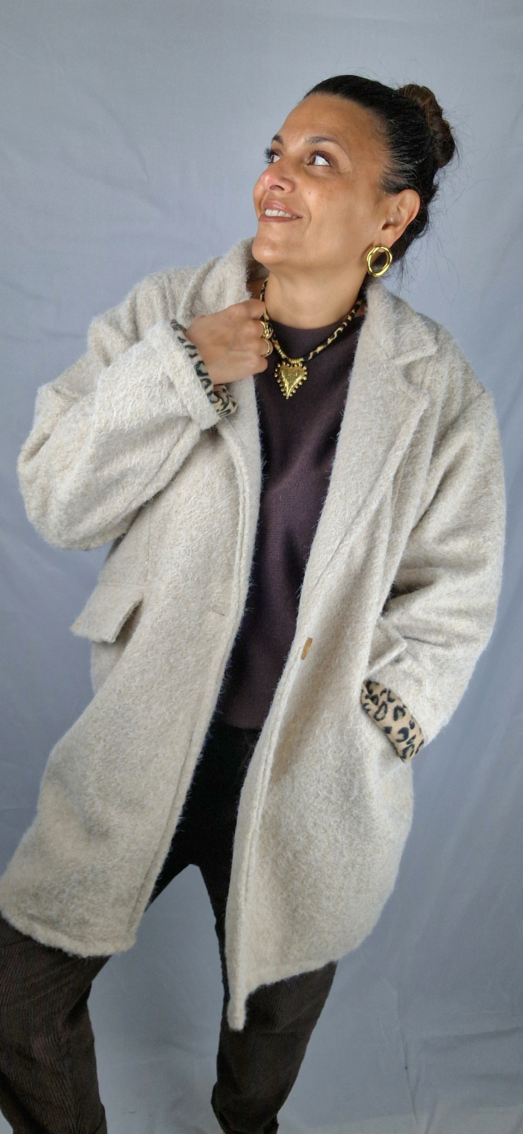 Douceur, chaleur et allure assurée avec ce manteau mi-long au toucher laineux et moelleux. On adore son coloris écru intemporel relevé d’une étoile léopard dans le dos et sa doublure intérieure assortie. Une pièce pleine de caractère, parfaite pour affronter la saison avec style et confort. Ses poches avant ajoutent la touche pratique qu’on aime tant.
