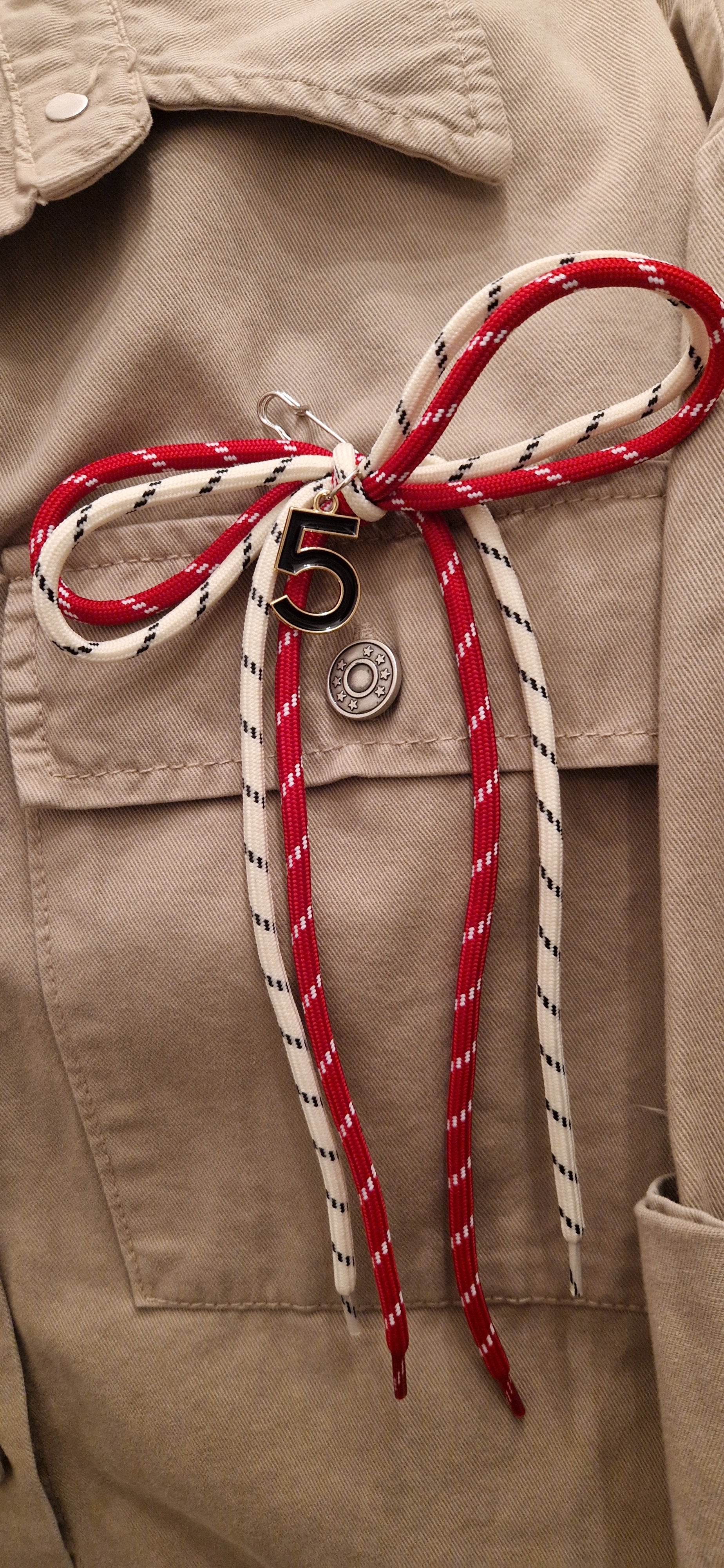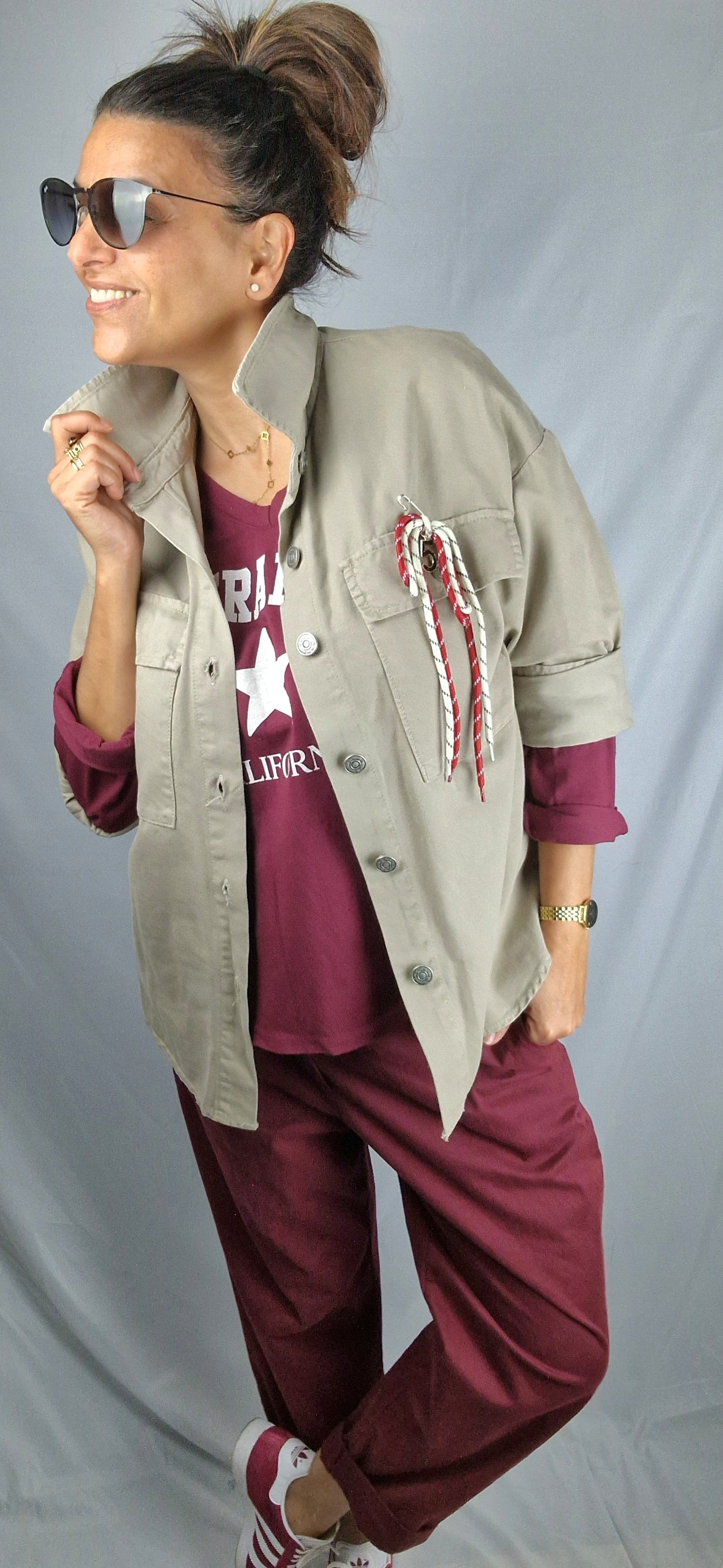 Surchemise beige manches longues à col chemise avec boutons et deux poches avant un style un peu cool parfaite à porter seule ou superposée et vendue avec une broche nœud bordeaux et blanc pour une touche originale